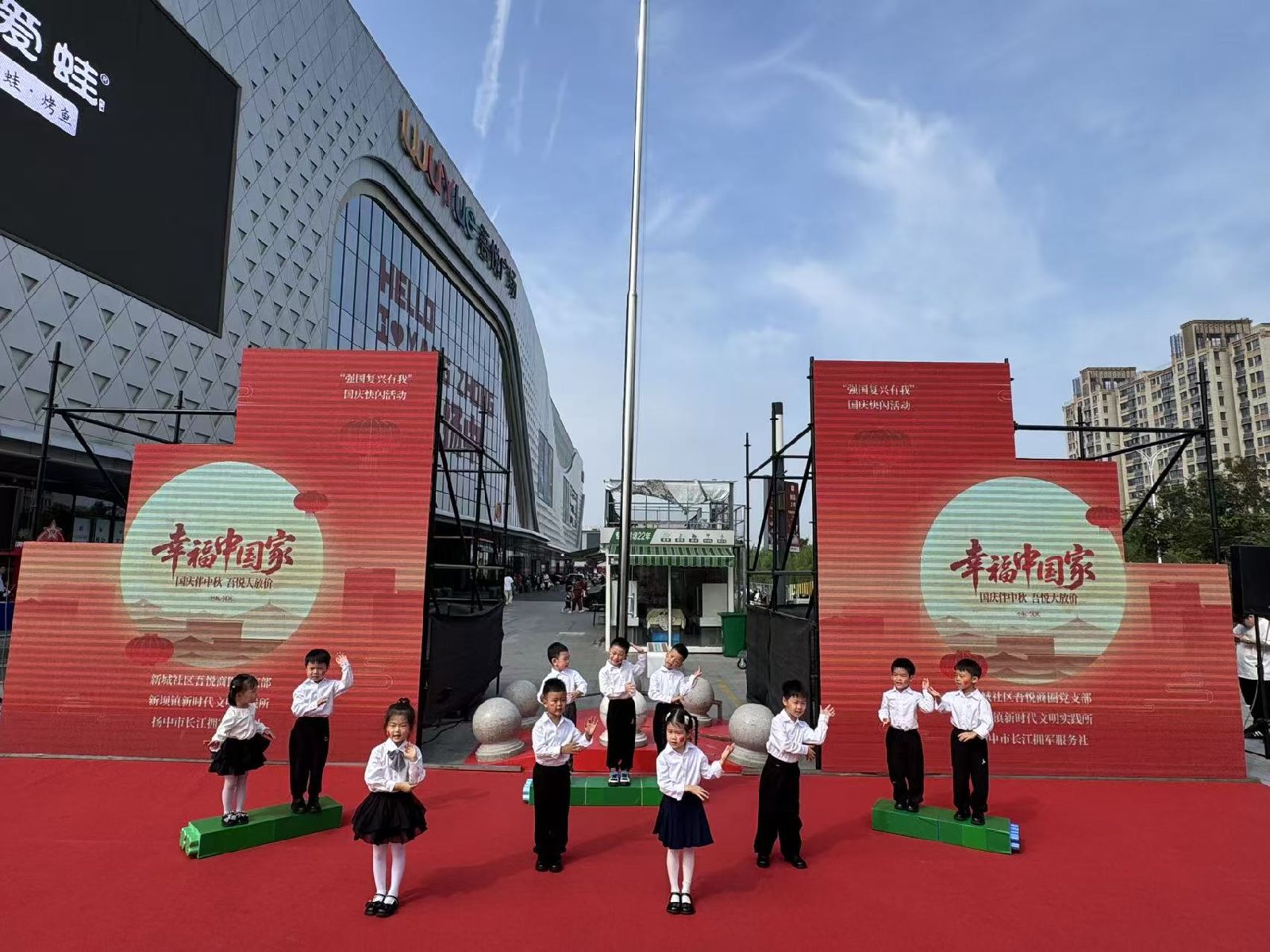 10月1日,新坝镇新时代文明实践所、新城社区吾悦商圈党支部、扬中市长江拥军服务社在吾悦广场举办“强国复兴有我”国庆快闪活动。活动中,大家挥舞着五星红旗,唱响歌曲《我爱你中国》,小朋友献上小合唱,朗诵等节目,用最真挚、热烈的情感祝福伟大祖国76岁华诞。(田浩淼)
